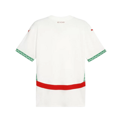 The 2025 Morocco Soccer Jersey Away – AFCON – Fan Version comes in a clean white base that gives it a lighter and more minimal look compared to the traditional red home shirt. Green detailing around the V-shaped collar and sleeve edges adds contrast and ties the design back to the national colors. The Moroccan crest sits clearly on the chest, while the brand logo appears in red, creating a balanced color combination. This Morocco away jersey was worn during AFCON 2025 and is available here in its fan edition for everyday supporters.