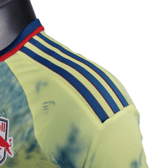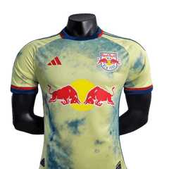 The kit features the iconic red and white stripes of the New York Red Bulls, with the team's logo prominently displayed on the chest. The player version also includes the official MLS patch on the sleeve, adding an extra touch of authenticity.