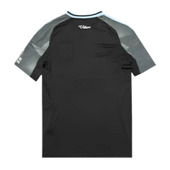 The material has a smooth finish that keeps the black base clean and consistent. The lighter shoulder detailing adds structure to the upper part of the shirt. Stitching along the sleeves and hem is simple and durable, built for repeated use. The printed sponsor and crest remain clear and sharp against the darker background.