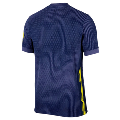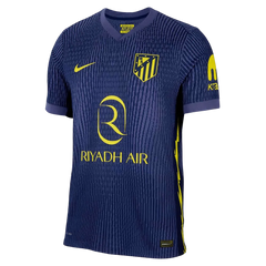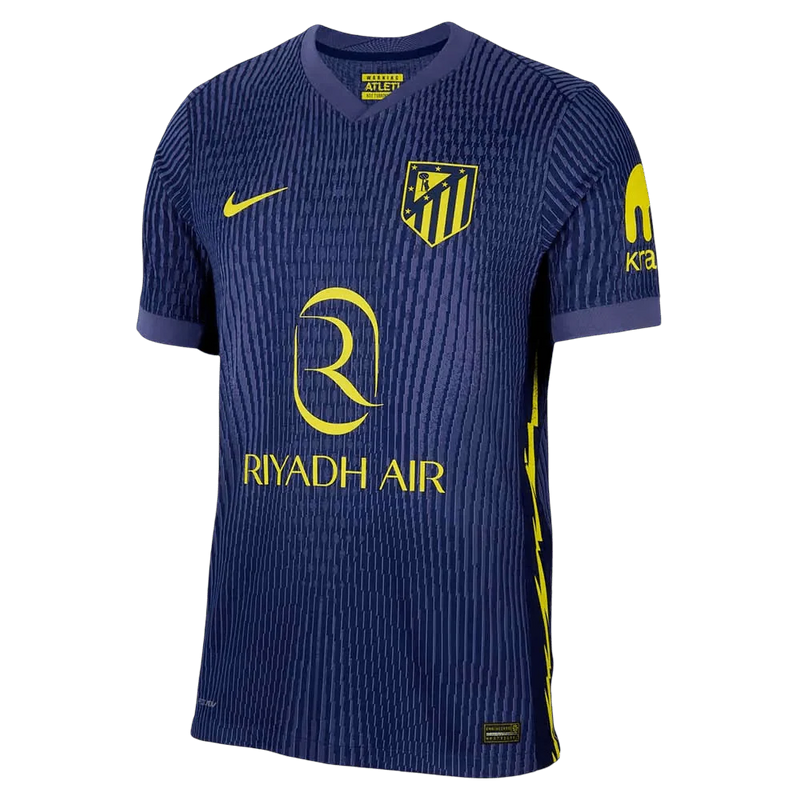 This Atletico Madrid jersey for the 2025/2026 away season takes a different direction from the traditional red and white stripes. The base comes in a deep navy tone, finished with thin vertical line details across the front that give the shirt texture without making it busy. Bright yellow accents appear on the sponsor, brand logo and club crest, creating strong contrast against the darker background. The “Riyadh Air” sponsor sits clearly in the center, while the crest remains positioned over the heart. This atletico de madrid jersey is the fan version, designed for everyday comfort rather than a fitted match cut.