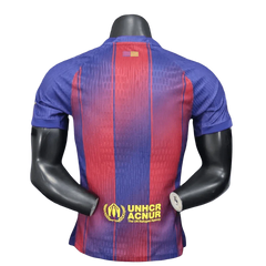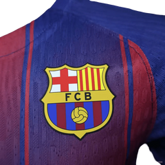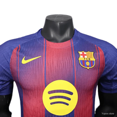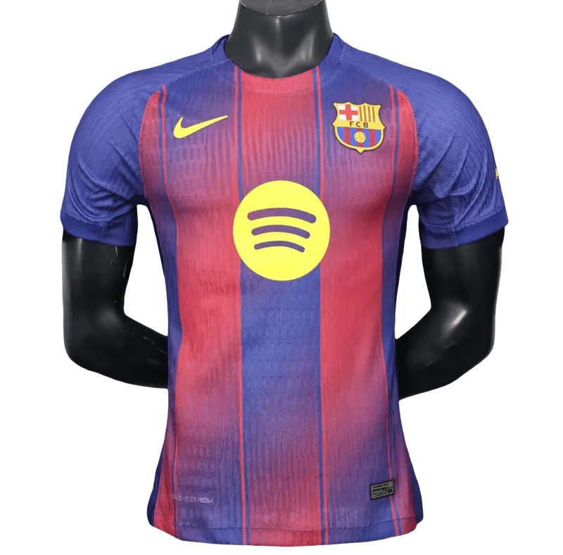 This Barcelona home kit for the 2025/2026 season keeps the traditional red and blue identity, but with a slightly blended transition between the stripes. Instead of very sharp separations, the red and blue panels fade softly into each other, giving the front a more modern look while still feeling unmistakably Barça. The yellow Spotify sponsor stands out clearly at the center of the chest, matching the yellow brand logo and complementing the club crest placed over the heart. This barcelona home jersey is the player version, designed to reflect what the team wears during official La Liga matches.