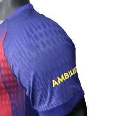 This barcelona home kit has a tight, athletic cut. The sleeves sit slightly closer to the arms, and the torso is more contoured compared to the relaxed fan version. The neckline keeps its structure without feeling restrictive. Overall, the silhouette feels more technical and match-ready.