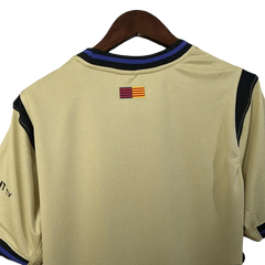 This Barcelona away jersey for the 2025/26 season comes in a soft yellow tone that gives it a lighter and more minimal look compared to the traditional home colors. The navy collar and sleeve edges frame the shirt nicely and add contrast without making it too busy. The Spotify sponsor appears in black at the center of the chest, and the club crest sits over the heart in a darker finish that stands out clearly against the yellow base. It’s a clean design that feels different from the usual red and blue, while still being unmistakably Barça.