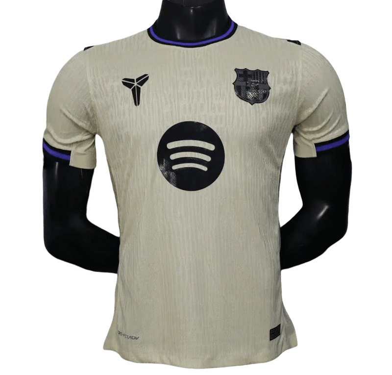 This Barcelona away jersey for the 2025/2026 season takes a very different approach compared to the classic red and blue. The base comes in a light beige tone, almost sand-colored, which gives it a calmer and more minimal look. Up close, you can notice fine vertical lines running through the fabric, adding texture without making the design busy. The black Spotify sponsor stands out clearly in the center of the chest, and the club crest appears in a darker finish over the heart. Small blue and red accents on the sleeves quietly remind you of the club’s traditional colors. This is the barcelona away jersey in its player version, the same style worn during official matches.