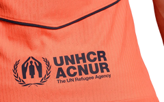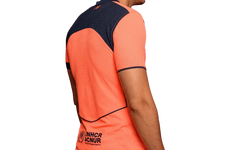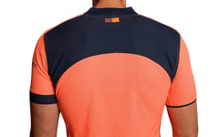 The orange base has a clean, even finish that keeps the color vibrant. The navy sponsor and crest stand out clearly without overwhelming the shirt. Stitching around the shoulders and sleeves is neat and durable, built for regular wear. The curved line across the lower front blends into the design and gives the shirt a modern shape.