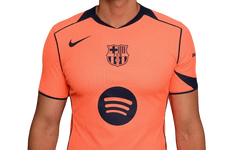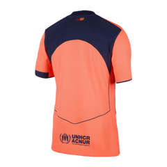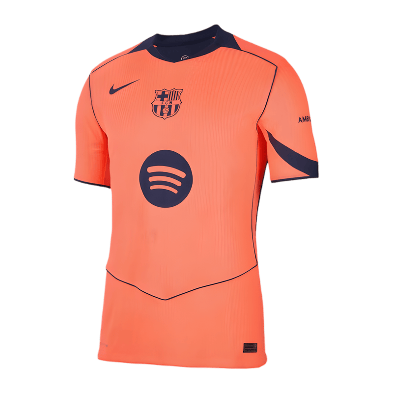 This Barcelona third jersey for the 2025/26 season comes in a bright orange base that immediately catches the eye. It’s a strong contrast to the usual red and blue, giving the shirt a fresh identity while still carrying clear club details. The dark navy collar and sleeve accents frame the upper part of the shirt, and the Spotify sponsor sits centrally in navy for sharp contrast. A subtle curved seam line runs across the lower front, adding structure without overcomplicating the design. This third jersey barcelona is the fan version, made for daily comfort rather than a fitted match cut.