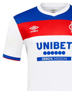 The brilliant white base dominates the jersey, with the prominent red chest band featuring a white Umbro logo and sleek monochrome Rangers crest. What makes this Rangers football kit special is the solid blue panel across the shoulders and upper chest that adds contrast and depth, creating a sophisticated color-blocked look.