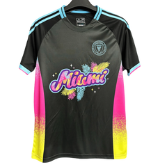 The inter miami jersey 2024 Black Limited Edition features an exclusive Miami Vice-inspired design with neon 'Miami' script surrounded by tropical palm leaves and pink-to-yellow gradient side panels. This inter miami black jersey combines authentic 80s nostalgia with sophisticated retro aesthetics, creating wearable art that represents both football culture and South Florida's legendary Vice City heritage.