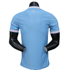 The material is thin and breathable, designed for performance. The sky blue base has a smooth surface that keeps the white sponsor and crest details clean and defined. Seams are flat and neatly finished so the shirt sits comfortably against the skin without unnecessary bulk. The overall build feels technical and match-ready rather than casual.