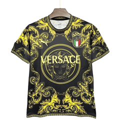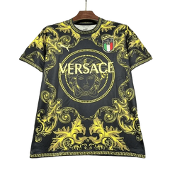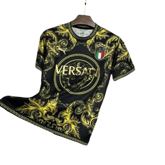 The Italy Versace jersey gold special kit combines luxury fashion design elements with traditional Italian football colors in an exclusive gold palette, featuring premium materials, sophisticated styling details, and luxury finishing that distinguishes it from standard team jerseys.