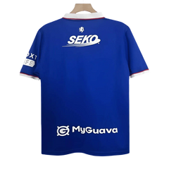 The traditional Rangers blue dominates the jersey, complemented by distinctive white and red accents that maintain the club's iconic color scheme. What makes this Rangers football kit special is the classic ribbed polo collar with tipping detail, paired with self-fabric sleeve cuffs featuring piping that enhances the kit's traditional aesthetic.