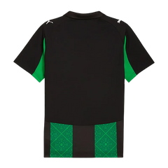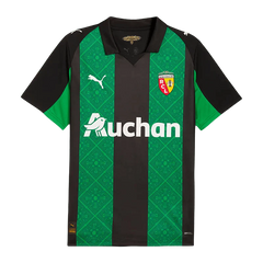 The RC Lens Jersey 2025/2026 Away Fan Version showcases an innovative black base with striking green stripes featuring unique geometric patterns that pay tribute to local architectural heritage. This RC Lens away jersey incorporates geometric shapes inspired by the iconic kiosk on Place Verte (now renamed Place de la République), creating a distinctive design that connects the club with Lens city landmarks. The 120th anniversary edition features the special laurel wreath above the crest and commemorative collar inscription, representing the final collaboration with current equipment manufacturer before the transition to new partnership in 2026-27.