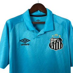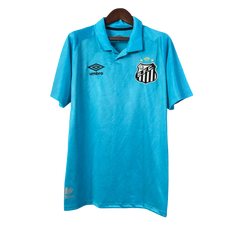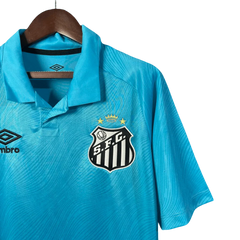 The Santos Neymar Jersey – 2025/2026 Third Fan Version steps away from the traditional black and white stripes and introduces a bright turquoise blue base. The color gives this neymar santos third jersey a fresh and different identity compared to the home and away kits. The club crest remains over the heart in its classic black and white shield, while the brand logo sits opposite on the chest. The overall look is simple but bold because of the strong blue tone.