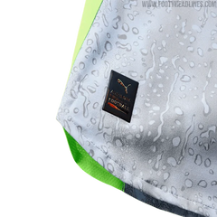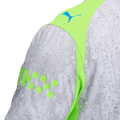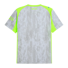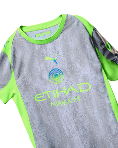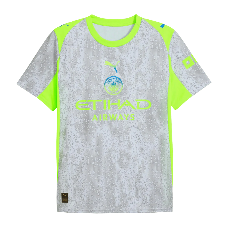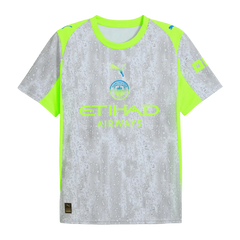 The Sky Blues Third Jersey – 2025/2026 Fan Version stands out with a light grey base combined with bright neon green sleeves and side panels. The front features a textured pattern that gives the shirt depth without making it heavy visually. The “Etihad Airways” sponsor appears across the chest in a matching neon tone, while the club crest and brand logo sit clearly above. The collar follows the same bright accent, framing the neckline and reinforcing the contrast. This man city third kit in its fan version is made for everyday wear rather than a tight match fit.