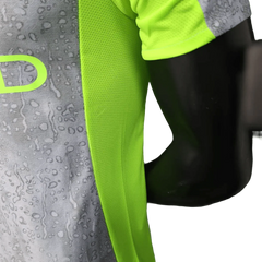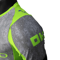 The material is thin and flexible, with the textured grey pattern integrated directly into the fabric. This keeps the shirt lightweight while maintaining visual depth. Seams are flat and clean, helping reduce bulk and friction. The neon panels are seamlessly connected to the body, preserving a sharp and balanced outline.