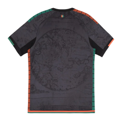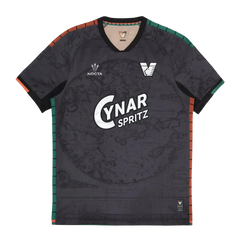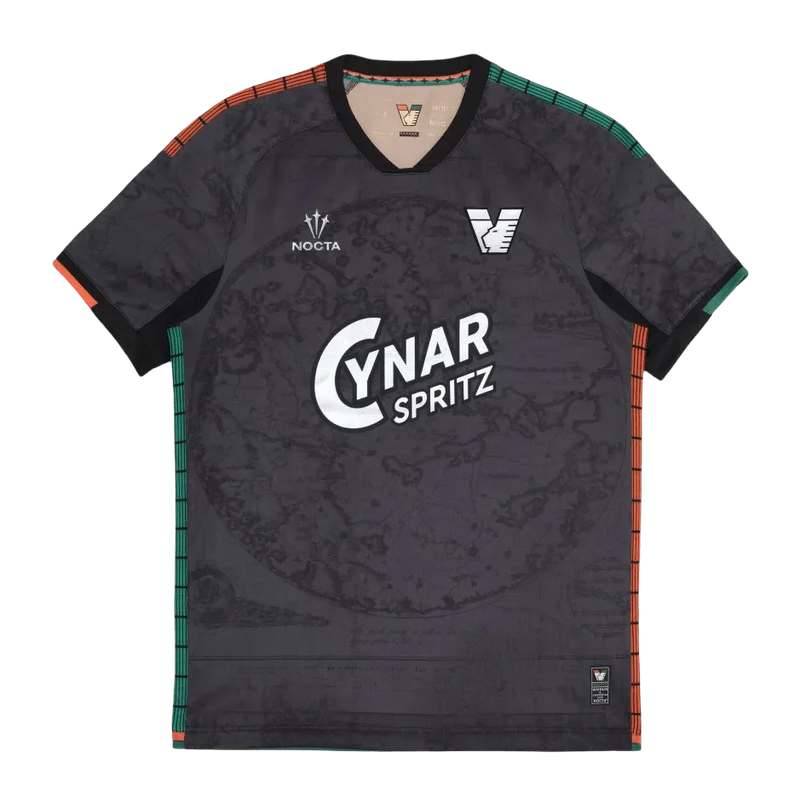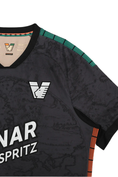 This Venezia home kit for the 2025/2026 season doesn’t follow the usual football template. Instead of bright colors or bold stripes, the shirt comes in a deep dark tone with a subtle pattern across the front. From far away, it looks almost plain. When you get closer, you start to notice the detailed graphic built into the fabric. Small orange and green accents appear along the shoulders and sides, quietly referencing the club’s traditional colors. The crest sits clearly on the chest, keeping the design clean and balanced.
